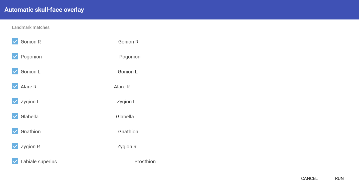 Skeleton·ID’s automatic SFO algorithm is fast and accurate. However, its accuracy is directly related with the quantity and quality of the data. In particular, a large number of landmark pairs (>8) precisely located together with adequate soft tissue depth and direction information is crucial to increase the accuracy and confidence in the automatic results.