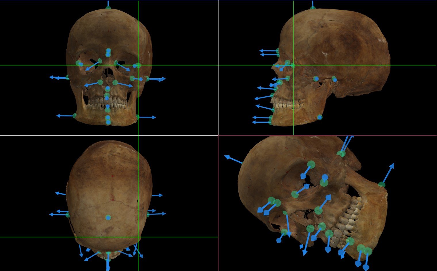 Figure 3. A screenshot of Skeleton·ID showing a 3D skull with craniometric landmarks (green points) and soft-tissue vectors (blue arrows) pointing towards the corresponding facial landmarks.